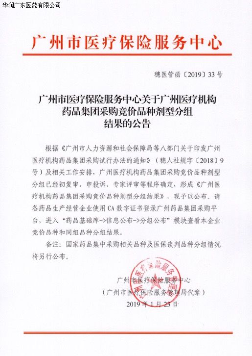 華潤廣東醫(yī)藥有限公司關于廣州醫(yī)療機構藥品集團委托集中議價結果公布及合同簽訂的通知