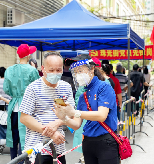 廣東德信行大藥房員工積極響應(yīng)各地政府街道號召,主動挑起央企擔(dān)當(dāng),作為志愿者到疫情一線支援核酸檢測?!跋壬梢詫⑦@個粵核酸碼截圖,下次直接展示截圖就能核酸采樣了。”多次支援的黨員代表梁琪,駕輕就熟地指導(dǎo)著居民采樣,她親切耐心地答疑解惑,街坊們紛紛為她點(diǎn)贊。