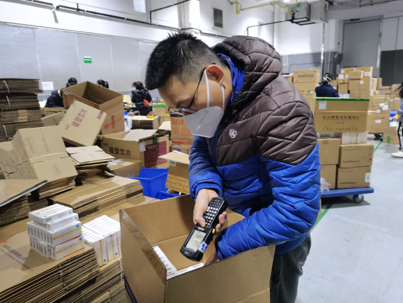 隊(duì)伍成員一到倉庫就投入忙碌而有序的工作中,在一線物流同事傳幫帶的引領(lǐng)下,隊(duì)員們很快學(xué)會(huì)了基本的操作流程,紛紛投入到各自崗位工作中。沒有一份工作是輕而易舉的,都需要每位人員時(shí)刻保持仔細(xì)嚴(yán)謹(jǐn)?shù)墓ぷ鲬B(tài)度。如揀選藥品,從收到訂單、尋找貨位碼、再到掃碼數(shù)貨,這看似簡單的工作實(shí)際內(nèi)里大有學(xué)問,有些訂單會(huì)涉及到藥監(jiān)碼掃碼,并且一個(gè)訂單就要掃上百個(gè)碼;再如復(fù)核貨品,選好的貨品要經(jīng)過二次清點(diǎn)且確認(rèn)無誤后按批裝箱,不能出現(xiàn)任何失誤。每個(gè)步驟都十分挑戰(zhàn)工作人員的細(xì)心與耐心,確保送到醫(yī)院及社區(qū)手中的防疫物資準(zhǔn)確無誤。