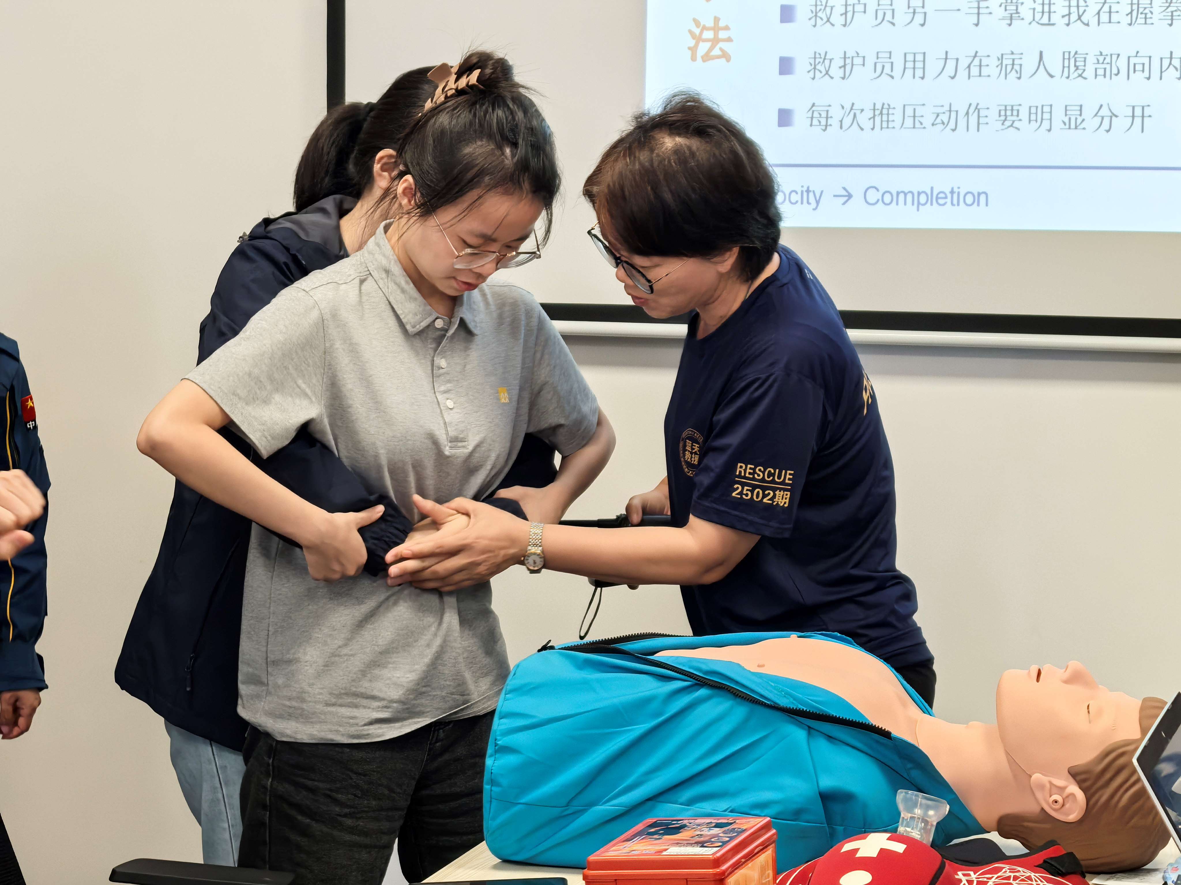 活動(dòng)伊始,湛江市藍(lán)天救援隊(duì)的專業(yè)講師毛成通過專業(yè)知識(shí)講授、實(shí)際案例分析等形式,圍繞火災(zāi)逃生、心肺復(fù)蘇、海姆立克急救法等重要主題展開培訓(xùn)。大家在現(xiàn)場實(shí)操練習(xí)徒手心肺復(fù)蘇操作及海姆立克急救法。