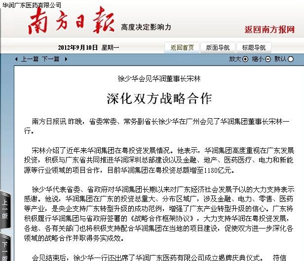 新成立的華潤廣東醫(yī)藥有限公司是由華潤醫(yī)藥商業(yè)集團(tuán)與廣東中健醫(yī)藥有限公司強(qiáng)強(qiáng)聯(lián)合、共同組建的醫(yī)藥流通企業(yè)。華潤醫(yī)藥商業(yè)集團(tuán)(原北京醫(yī)藥股份有限公司)是華潤醫(yī)藥旗下的大型醫(yī)藥商業(yè)企業(yè),在全國18個(gè)省、市、自治區(qū)設(shè)有36家全資或控股子公司。2012年預(yù)計(jì)經(jīng)營規(guī)模達(dá)500億元,位居全國醫(yī)藥商業(yè)行業(yè)前三強(qiáng)。廣東中健醫(yī)藥有限公司成立于2003年,2012年預(yù)計(jì)營業(yè)額達(dá)80億元,在廣東醫(yī)藥流通企業(yè)中名列前茅。該公司專注于高端優(yōu)質(zhì)產(chǎn)品的引進(jìn),與國內(nèi)外上百家制藥企業(yè)、國內(nèi)幾十家大型商業(yè)客戶建立了長期穩(wěn)固的合作關(guān)系。同時(shí),他們還注重開發(fā)新藥、特藥的區(qū)域內(nèi)和全國總代理,在全國各省、市、自治區(qū)建有二級商業(yè)分銷平臺,醫(yī)院純銷網(wǎng)絡(luò)覆蓋整個(gè)廣東省。依托領(lǐng)先同行的進(jìn)口服務(wù)戰(zhàn)略,該公司為國外貿(mào)易提供了按時(shí)付款、順暢通關(guān)、及時(shí)藥檢等進(jìn)口貿(mào)易全流程,包括“一次藥檢多次通關(guān)”、加急優(yōu)先藥檢、自建高標(biāo)準(zhǔn)保稅庫和靈活的轉(zhuǎn)口貿(mào)易渠道等的最優(yōu)方案選擇。這次雙方合作,共同組建華潤廣東醫(yī)藥有限公司,實(shí)現(xiàn)了優(yōu)勢互補(bǔ)、資源共享,為企業(yè)的發(fā)展開辟了更廣闊的空間。
