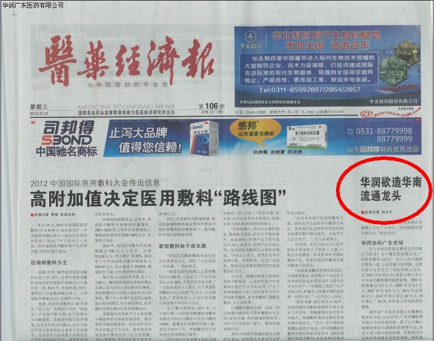 2012年9月9日,華潤醫(yī)藥商業(yè)集團(tuán)、廣東中健醫(yī)藥有限公司合作成功暨華潤廣東醫(yī)藥有限公司成立揭牌慶典在廣州萬達(dá)希爾頓隆重舉行。本次活動受到了華潤集團(tuán)的重視和廣東省政府的關(guān)注與支持,廣東衛(wèi)視、中國醫(yī)藥報(bào)、醫(yī)藥經(jīng)濟(jì)報(bào)、南方日報(bào)、廣州日報(bào)、羊城晚報(bào)等知名媒體前來慶賀并報(bào)道了本次慶典。