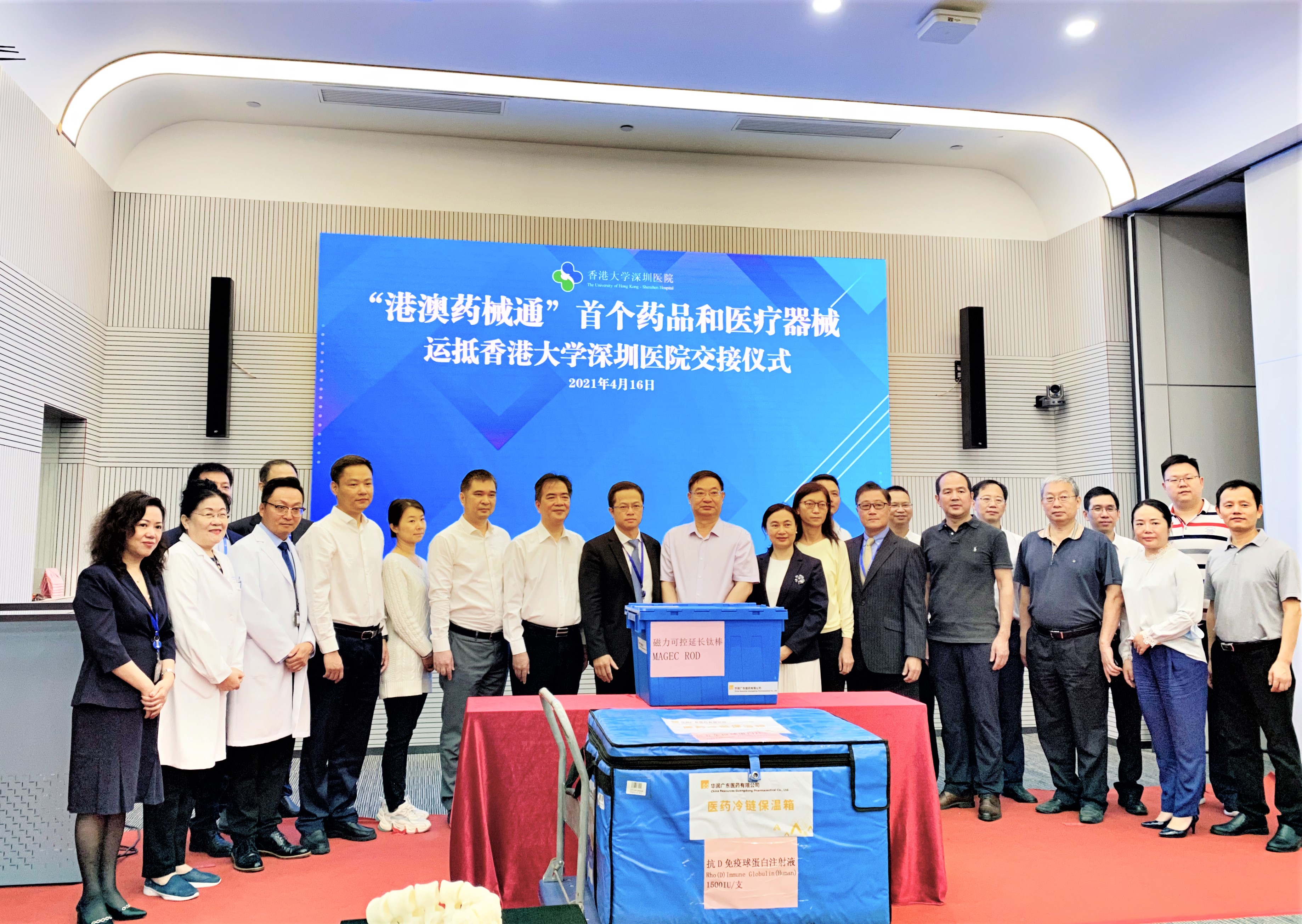 2021年4月16日上午九點,香港大學(xué)深圳醫(yī)院(以下簡稱:港大深圳醫(yī)院)和華潤廣東醫(yī)藥有限公司(以下簡稱:華潤廣東醫(yī)藥)正式交接“港澳藥械通”首個藥品(抗D免疫球蛋白注射液)和醫(yī)療器械(磁力可控延長鈦棒)。